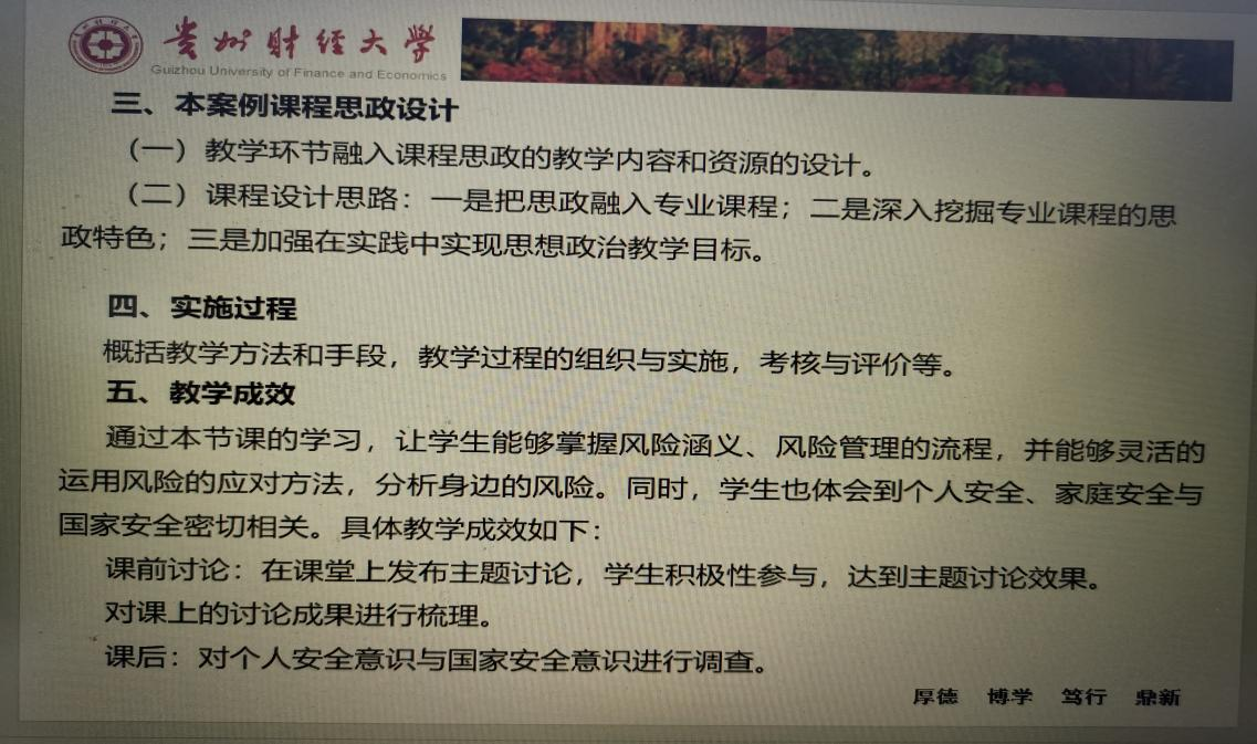 姜玉勇以《风险分析与管理》这门课程为例,从案例教学目标、案例思政教学目标、案例课程思政设计、实施过程、教学成效、特色与创新六个方面进行了详细的讲解。