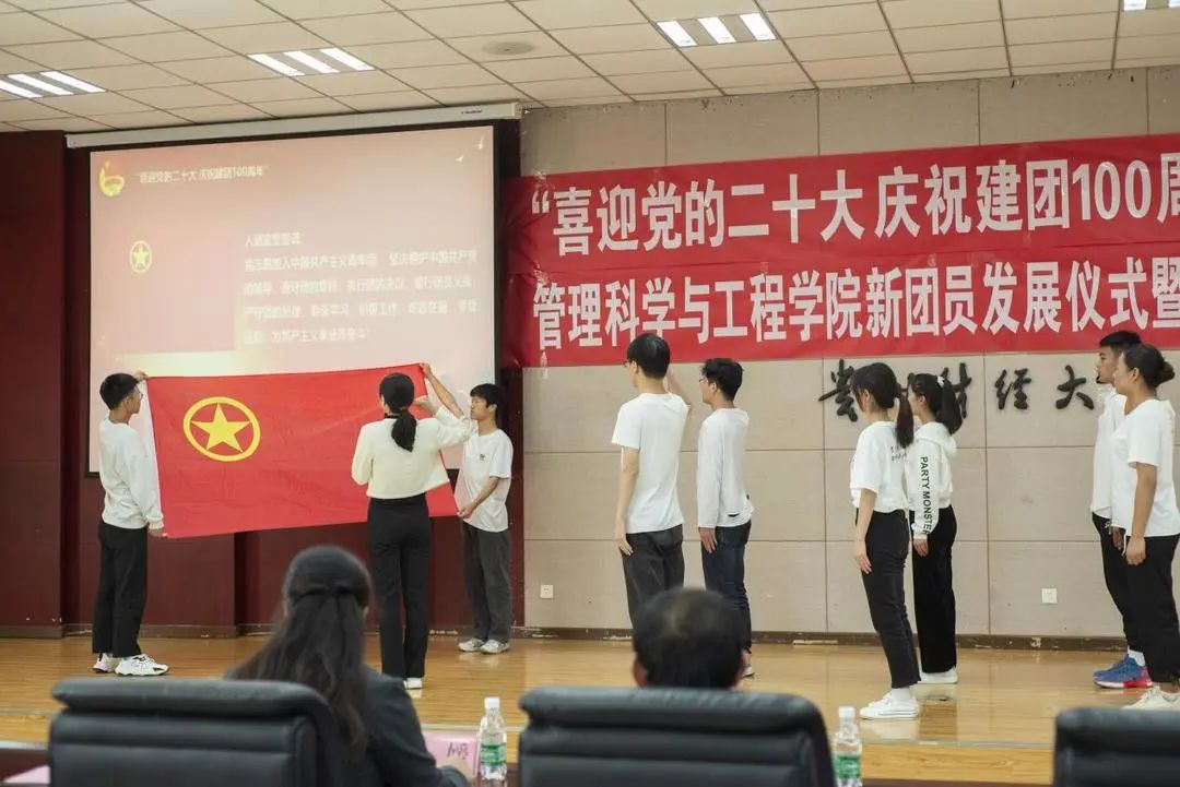 2022年,公司新发展了3名共青团员,张颖、魏媛、李恩东为新发展团员佩戴团徽,院团委负责人吴沛丽带领新团员、老团干部面向团旗宣誓和重温入团誓词。