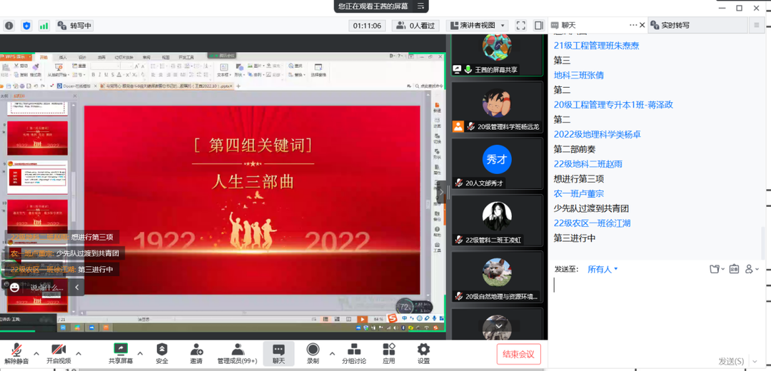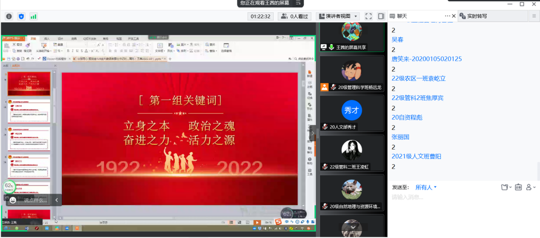 为深入学习习近平总书记在中国共青团成立100周年大会上的讲话内容,提高团员青年的思想内涵、综合素质、责任意识,10月18日,公司通过腾讯会议线上顺利举行“青春奋进正当时,筑梦不负新时代”主题团课暨“青马工程”的培训。现suncitygroup太阳集团人才招聘处副处长、suncitygroup太阳集团原党委副书记王茜担任主讲嘉宾,与院2022年入团积极分子,院团委员工干部,2020级、2021级、2022级各班级团支部团干及优秀青年共252人一起开展“与党同心 跟党奋斗——六组关键词读懂习近平总书记的殷殷嘱托”第一期主题团课。
