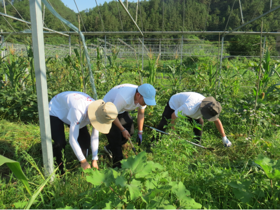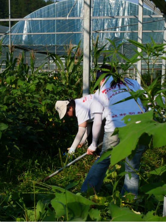 讲解结束,三下乡成员迅速分组开展劳作,有的同学蹲下身子用手拔除贴近作物的杂草,有的同学借助镰刀清理高大杂草,有的同学则用铲子集中搬运清理出的杂草堆。活动过程中,针对如何高效清理根系发达的杂草等问题,三下乡全体成员在实践中进行了交流学习,提高了工作效率;虽头顶烈日,但各位成员干劲十足。在大家的通力协作下,原本杂草蔓生的林下区域焕然一新,通风透光条件改善,为作物生长腾出更充足空间,同时也为后续田间管理奠定了更可靠的基础。