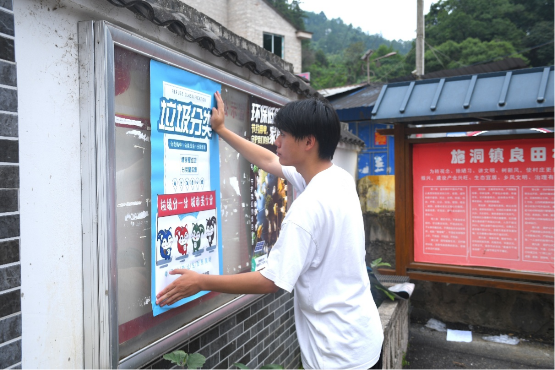 活动伊始,实践团成员在村主干道、文化广场等醒目位置悬挂环保主题海报。这些设计精美、图文并茂的宣传材料,系统展示了垃圾分类、节能减排等环保知识。在张贴过程中,不少村民驻足观看,团队成员抓住机会现场讲解,用当地方言耐心解答村民疑问,让环保理念更易被理解和接受。