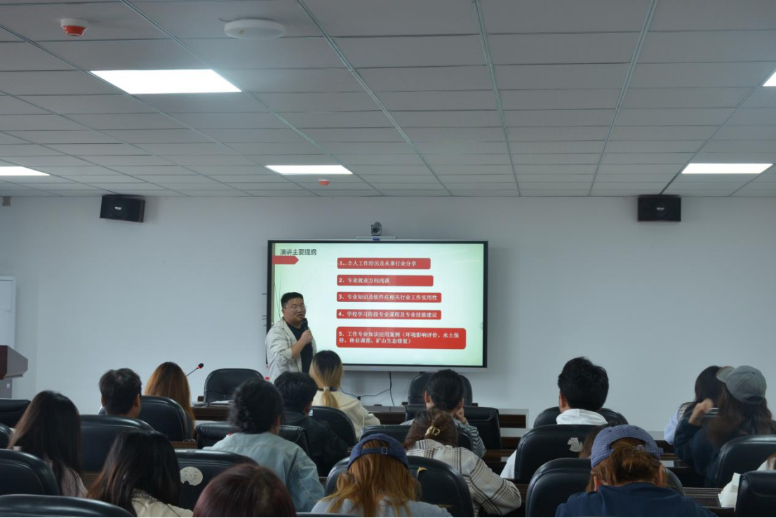 活动中,张仁兵员工以自身职业发展轨迹为主线,展开了系统而务实的经验分享。他首先回顾了个人成长路径:2017年5月至2019年5月,先后在两家环保企业从事环境影响评价专业技术工作;2019年至今,于贵州国创环保工程有限公司担任副总工程师,并在此期间成功取得环境工程中级工程师职称。他用真实清晰的职业进阶历程,为同学们描绘了一条可借鉴的职业发展蓝图。随后,学长深入剖析了环境相关专业的主流就业方向,细致讲解了专业软件的操作要点,并结合自身工作中制作专业图表的实际案例,将理论知识与行业实践紧密对接,让同学们对专业知识的落地应用有了更直观、更深刻的理解。在最后的互动交流环节,针对同学们在专业学习与职业规划中提出的各类问题,学长逐一耐心解答,并给出具体可行的建议,现场气氛热烈、交流深入。
