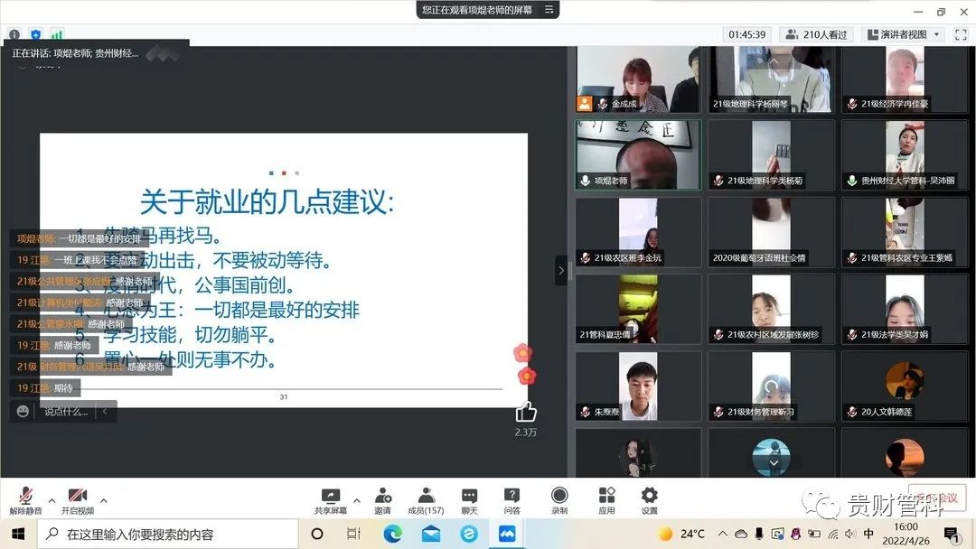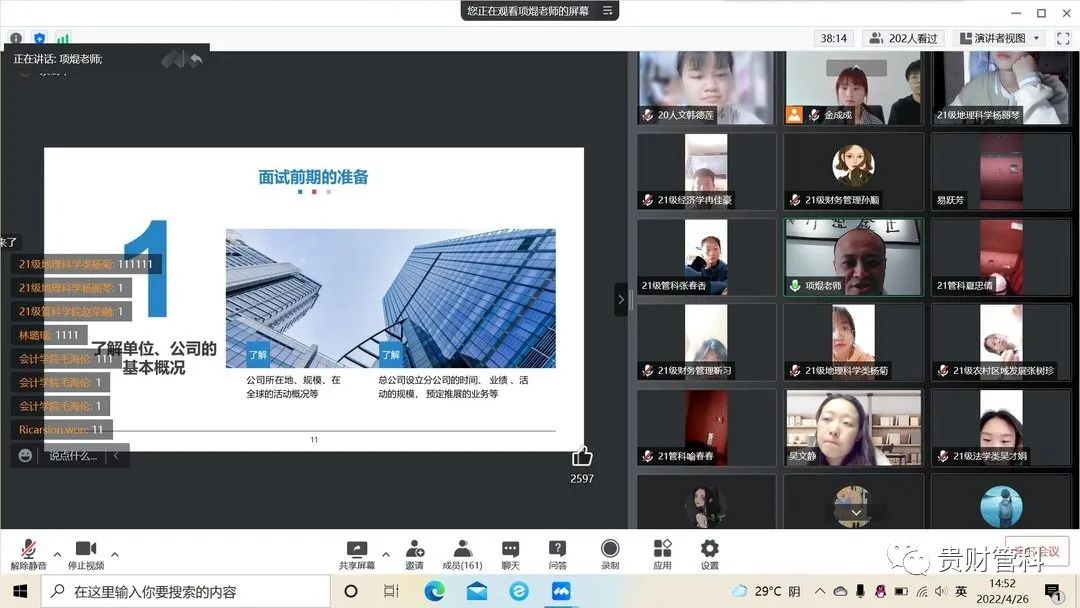 本次活动,项焜主要围绕面试形式与流程、面试前期准备、面试中的礼仪问题、面试常用问题解析等内容向同学们进行深入讲解。活动末尾,项焜结合其15年的职业生涯规划及面试工作经历为同学们详细解答了有关面试技巧、面试注意事项、职业规划侧重点、就业选择等同学们比较关注的问题,提出就业建议,建议同学们在后疫情时代,在考研和就业压力逐渐增大的大环境下,要随机应变、主动出击、不能被动等待;要调整好心态,乐观争取,努力拼搏;要多学习技能,切勿躺平,为毕业求职打好基础。