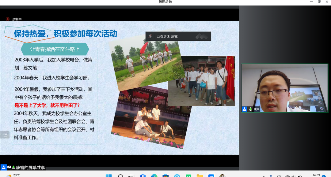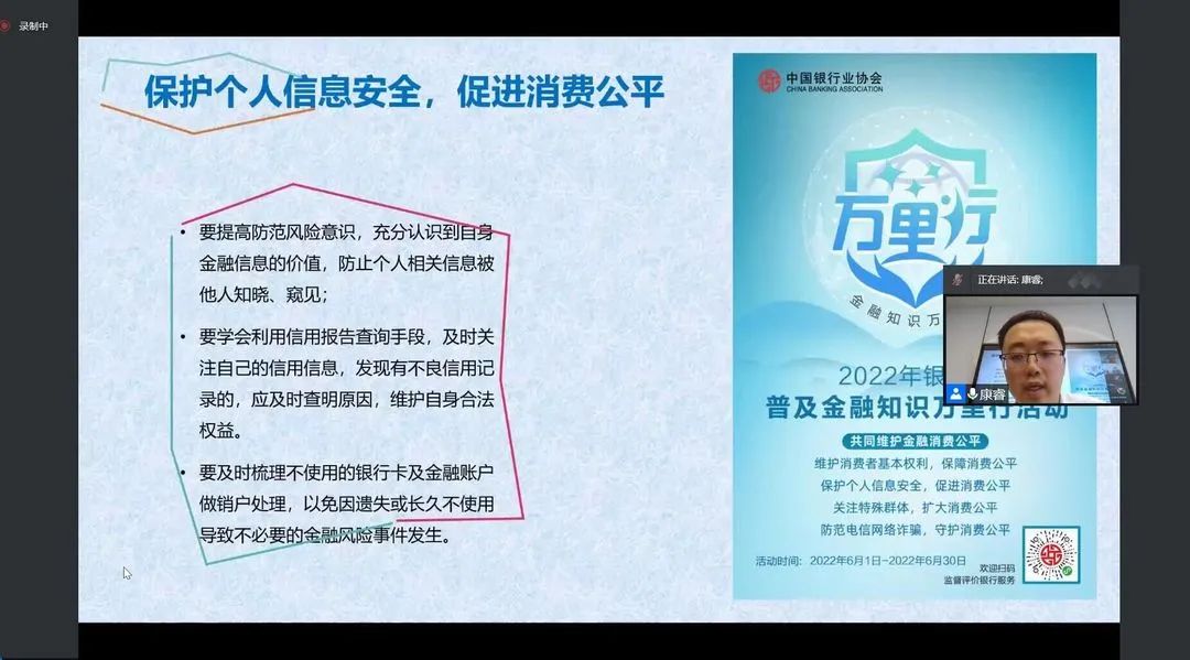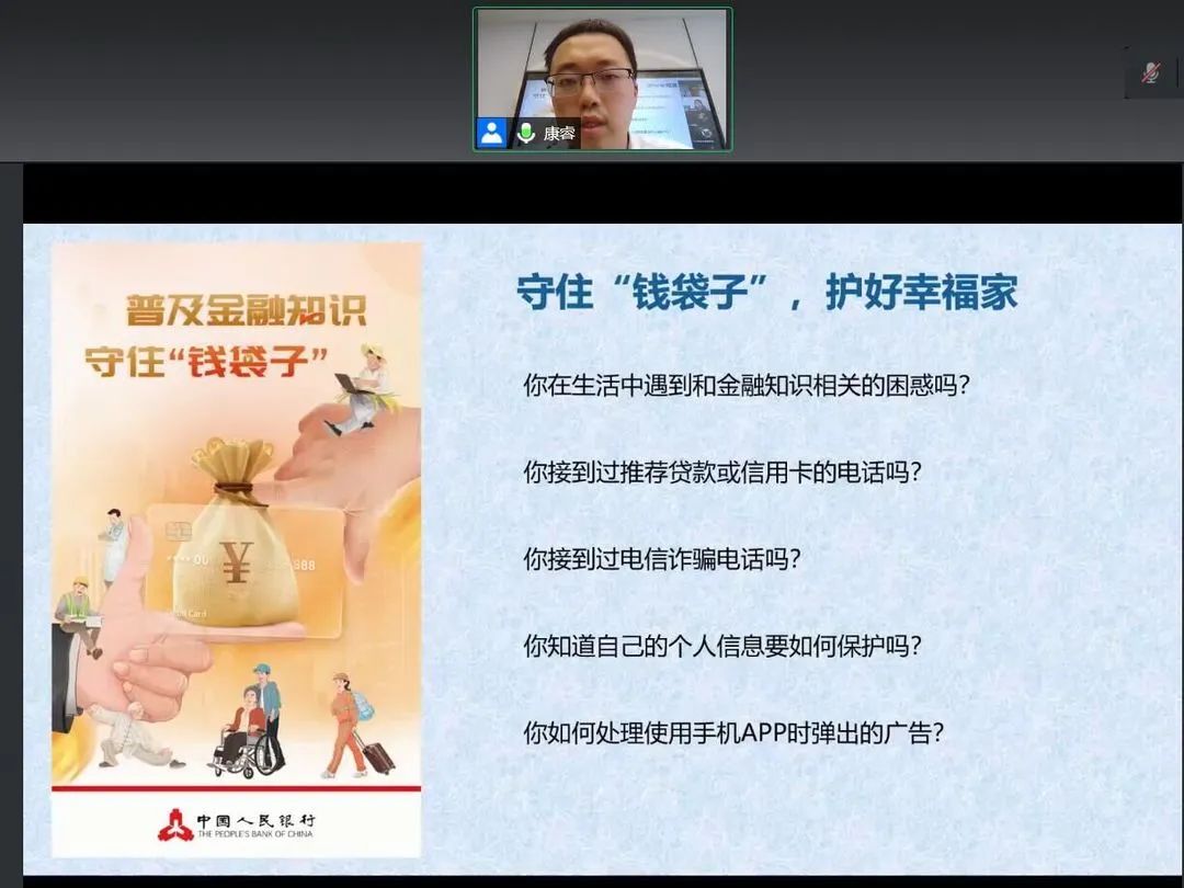 本次活动,康睿围绕消费者权益保护,以侵害老员工合法权益的常见案例为切入点,深入浅出地从多方面分析金融消费陷阱,提醒同学们要维护好自己的基本权益,保护个人信息,提高个人信用意识,养成良好的信用记录。此外,康睿作为公司2007级优秀员工,分享了自己在大学的学习成长经历和感悟,勉励同学们要珍惜大学时光,打好专业知识基础,加强个人技能提升,积极参加各类实践活动,要结合自身特点及求职方向进行综合考量,构建良好的人际网络关系。最后,康睿倡导同学们要树立正确的消费观、提前规划好老员工活和未来职业发展,坚定目标,砥砺前行。