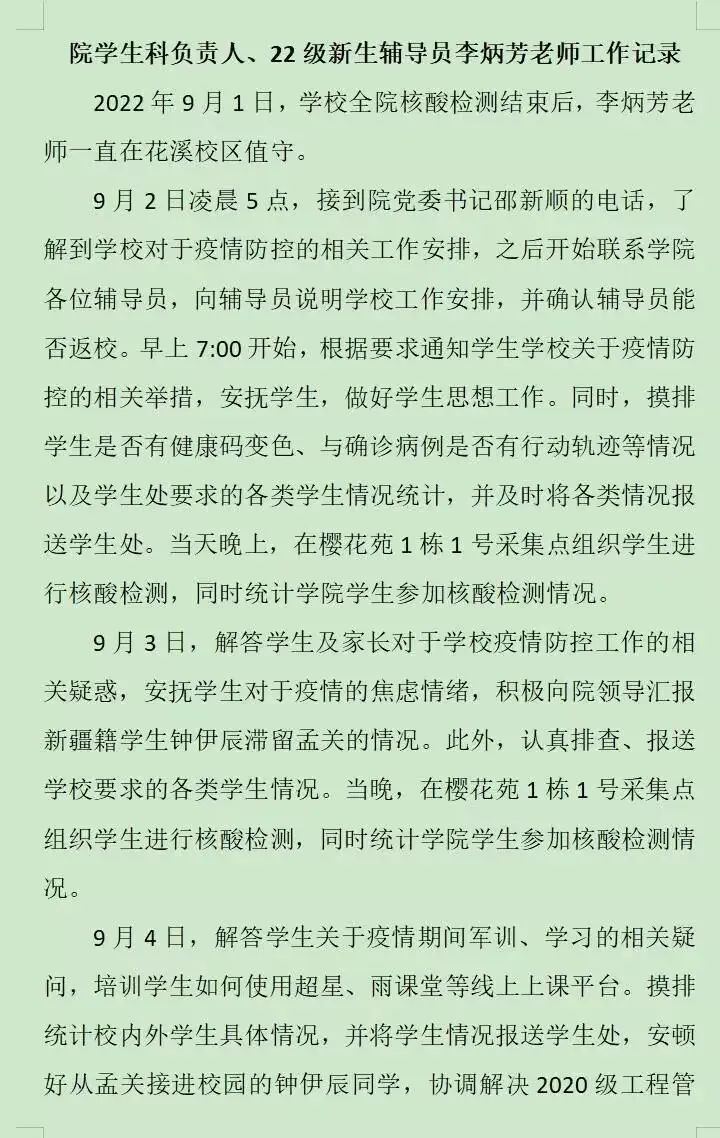 在实行静默管理期间,suncitygroup太阳集团的领导和老师以身作则,挺身而出。9月1日晚至今,管科公司返校到岗的领导老师有党委书记邵新顺、已调往招就处但仍在履行员工管理职责的原党委副书记王茜、员工科负责人李炳芳、专职组织员罗红艳,以及辅导员陈佳莲、姚吟吟、吴德凤、曾建霞(新入职的专任教师)等八名同志按照公司的统一安排部署,展开了所负责点位的全员核酸检测工作,并到员工宿舍走访进行思想政治工作,及时将公司的通知要求传达到公司师生。因静默管理不能到校的辅导员吴沛丽、赵本琴、院办公室副主任赵湘婷、教务科科长朱艳飞在家线上办公,公司党政领导班子其他成员及科室负责同志按照分工共同做好了相关工作。