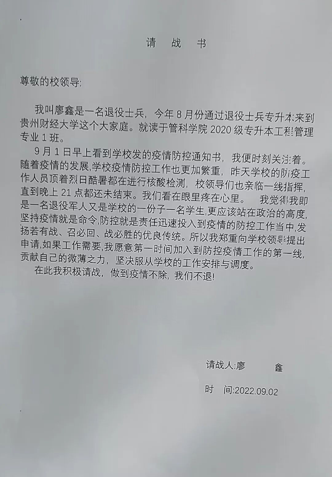 除了他们,还涌现了一批有志青年积极请战。公司20级专升本吕经波、廖鑫同学,作为曾经的退伍士兵、现在的一名贵财管科新生,向公司公司请战抗疫。