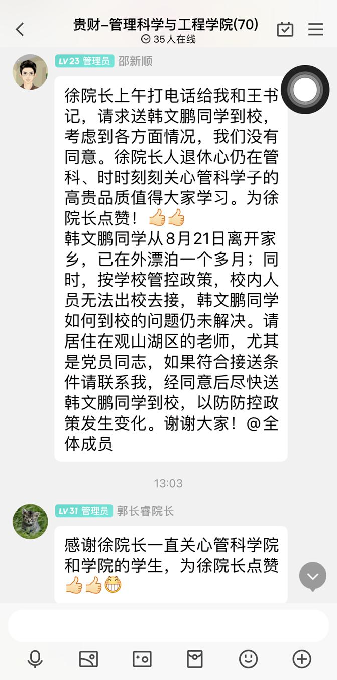 倾情尘世发红豆,化为春雨佛绿杨。凉风习习的秋季,疫情把人们隔离在小小的空间,却没有办法隔断人和人之间的真情。每一位学子都是公司的孩子,面对因疫情滞留校外的管科学子,无论是已退休的徐筑燕经理,还是主动请缨的马艳老师,都是照亮员工前进的红烛,给予员工润物般温暖!“欢迎你回家,韩文鹏同学!”