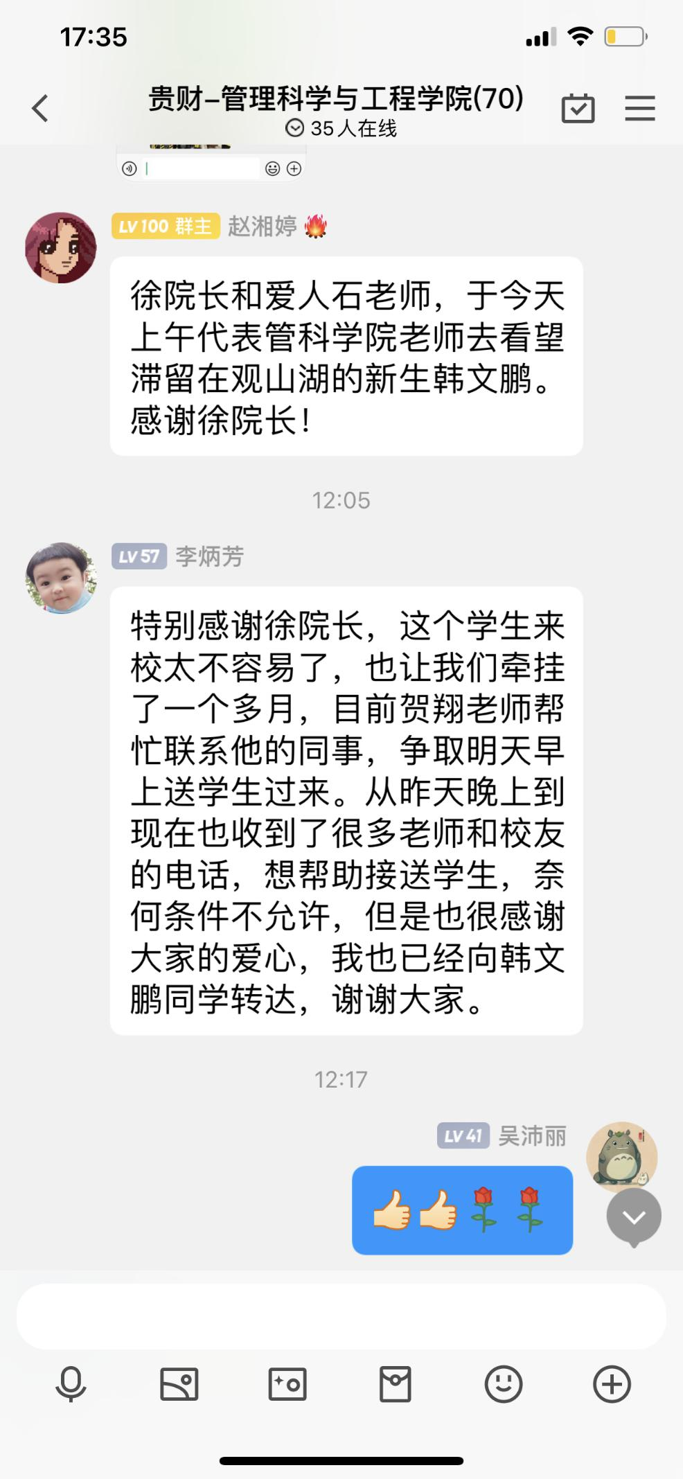 退休不褪色,尽管徐筑燕老师已经退休,但她仍心系管科公司,心一直系在管科学子身上,这支曾经照亮员工前进的红烛依然在默默发着光。对于公司老师的点赞和感谢,徐经理只是轻描淡写地说了一句:“退休人员贡献余热”。有一种爱叫无私奉献,有一种付出叫无怨无悔,有一种情叫春风化雨,虽然韩文鹏同学滞留校外,但公司的领导及老师们一直牵挂着他、关心着他,帮助他度过难关。在这梧桐落叶凉风习的秋季,公司的关心和牵挂,温暖了韩文鹏同学的心灵。