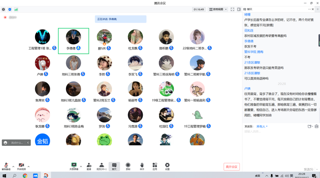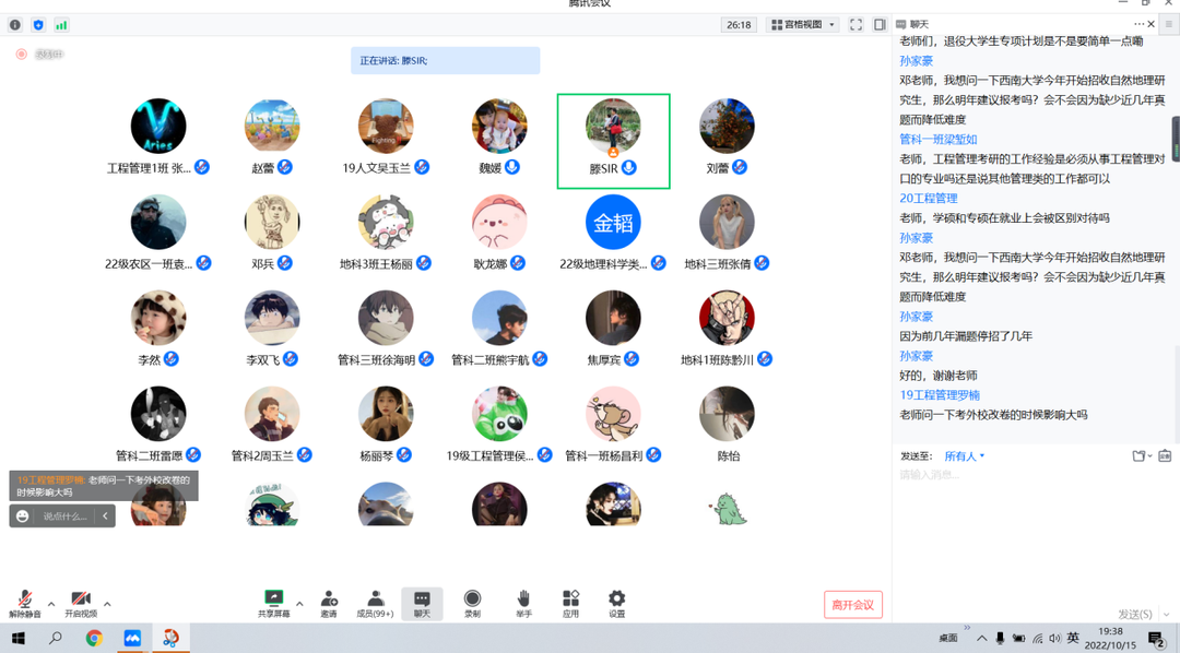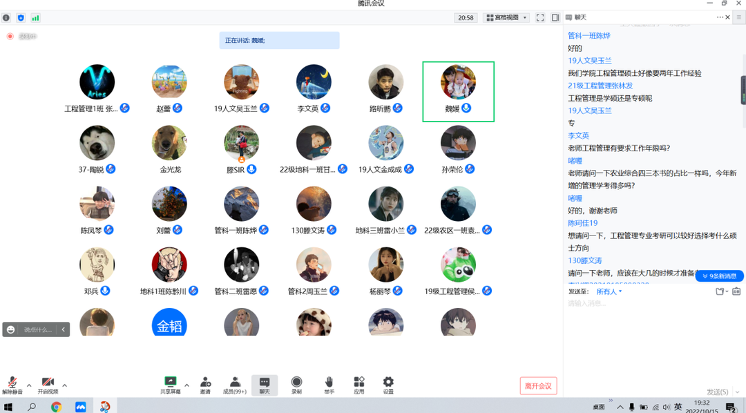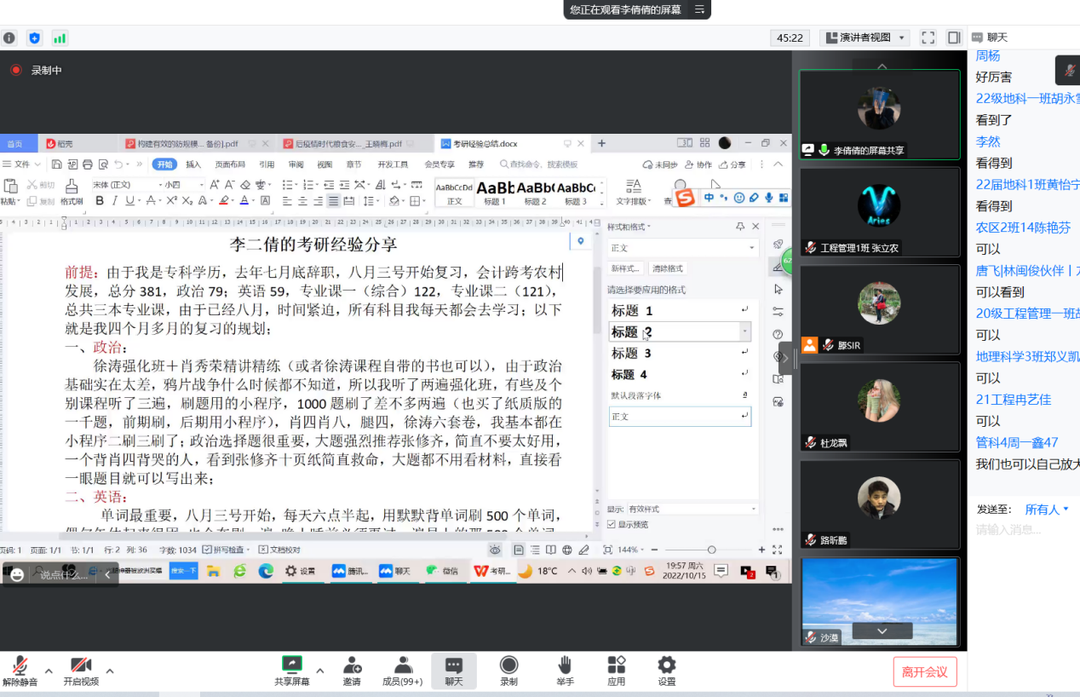 为持续推进我为群众办实事实践活动,用心用情为师生解难题。资环系教工党支部与公司团委联合开展“2022考研冲刺经验交流分享会”,实实在在帮助考研学子解决考研过程中的疑难困惑,增强公司学业质量提升。10月15日,交流分享会通过腾讯会议线上举行,suncitygroup太阳集团副经理魏媛、院团委负责人吴沛丽、资环系教工党支部全体教师、公司各年级300余名同学共同参与,会议由资环系教工党支部书记滕明雨主持。
