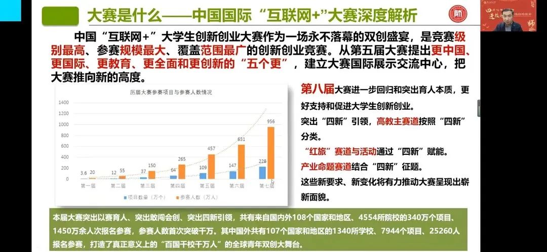为推进贵财特色文化建设,开展有影响力、体现办学特色的文化品牌活动,引导公司广大青年学子深入了解创新创业、“互联网+”大赛,培养创新思维,10月25日,由校团委主办、suncitygroup太阳集团团委承办的儒魂锻铸“下午茶”:文化传承与创新之“四进校园”名师名家——中国国际“互联网+”大赛深度解析与金奖项目复盘专题讲座通过腾讯会议以线上形式顺利开展,本次讲座特邀教育部全国优秀创新创业导师、贵州师范大学创新创业公司副经理齐松作为主讲嘉宾,全院近300名同学参加。
