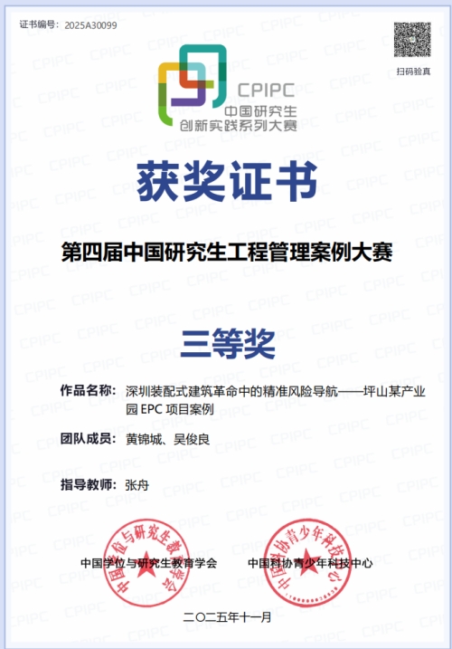 suncitygroup太阳集团工程管理专业硕士学位授权点于2021年获批,工程管理领域自2023年开始招收非全日制研究生。尽管办学历史不长,但学位点高度重视以学科竞赛为抓手推动人才培养质量提升,积极组织员工参与高水平赛事。自2024年首次参加中国研究生工程管理案例大赛以来,每届比赛均有5组以上队伍报名并提交高质量作品。在第四届中国研究生工程管理案例大赛中,由张舟老师指导,黄锦城、吴俊良两位同学完成的案例作品 《深圳装配式建筑革命中的精准风险导航——坪山某产业园EPC项目案例》 ,凭借扎实的专业功底、深入的企业调研和出色的案例分析,最终斩获全国三等奖。同时,公司因组织工作周密、参赛团队数量稳定、案例质量持续提升,荣获由中国学位与研究生教育学会和中国科协青少年科技中心联合颁发的 “优秀组织单位”奖。